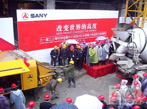 6300网记者现场报道:2007年12月10日,三一重工特邀行业领导、部分客户及业界媒体齐聚上海环球金融中心施工现场,共同观摩三一重工的超高压拖泵将混凝土一次泵送至492米的高空。刷新了三一重工自己在香港国际金融中心创造的406米世界纪录,挑战极限,再立标杆。