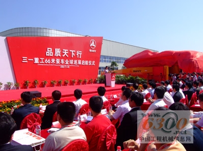 “‘品质天下行’三一重工66米泵车全球巡展正式启航!”今日的三一工业城在典型的“三一红”映衬下显得格外喜庆,迎空舒展开来的66米臂架泵车以其伟岸的身姿迎接着人们惊叹的目光。随着三一重工董事长梁稳根的一声宣告,三一工业城礼花齐放,鼓乐齐鸣。来自中国工程机械行业的专家,湖南省、长沙市有关领导,三一的客户代表以及各大媒体记者共计300多人喜聚一堂,见证了民族品牌问鼎吉尼斯纪录的辉煌。
