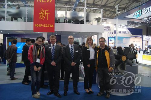 Perkins发动机有限公司市场拓展经理李骜华(Oliver Lythgoe)(左二)、营销专员伍祖炼(Julian Wood)(左三)、企业及营销传讯经理华莊安柰(Annette Ward)(右二)、与中国工程机械信息网记者亲切合影