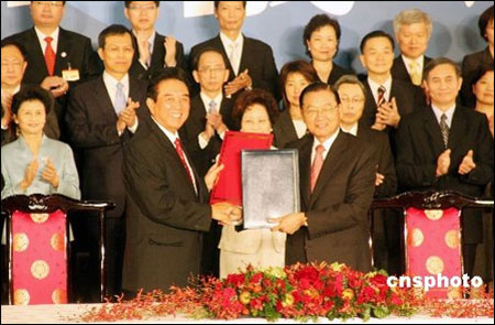 11月4日下午,海协会会长陈云林和海基会董事长江丙坤在台北签署有关两岸空运直航、海运直航、邮政、食品安全的4项协议。