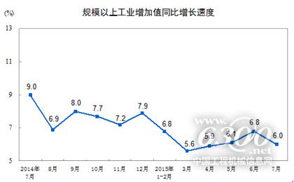 2015年7月份,规模以上工业增加值同比实际增长6.0%(以下增加值增速均为扣除价格因素的实际增长率),比6月份回落0.8个百分点。从环比看,7月份,规模以上工业增加值比上月增长0.32%。1-7月份,规模以上工业增加值同比增长6.3%。