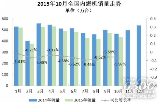 根据中国内燃机工业协会《中国内燃机工业销售月报》重点企业数据显示,2015年10月完成内燃机销量436.82万台,环比下降7.05%,同比下降5.97%;1-10月销量累计完成4693.23万台,同比累计下降5.01%;10月完成18224.35万千瓦,环比增长6.24%,同比增长7.66%,1-10月累计完成171509.8万千瓦,同比累计增长2.08%。乘用车市场迎来全年黄金销售期,累计销量远好于行业平均水平,同比累计增长4.61%;受国2升国3影响,柴油机市场10月的销量明显不如上月,同比累计降幅维持在14.51%。