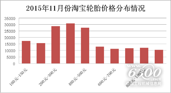 2015年11月份,线上轮胎的销售价格基本维持不变,从150元到1500元不等,而200-500元的轮胎价格区间依旧最受消费者欢迎,相较于上月变化不大。本月轮胎300-400元的成交量突破30000件大关。由此看出,平民化的价格仍然最受消费者的欢迎。