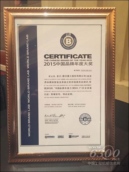 雷沃荣获2015年“中国品牌年度大奖NO.1”(农业装备行业)
