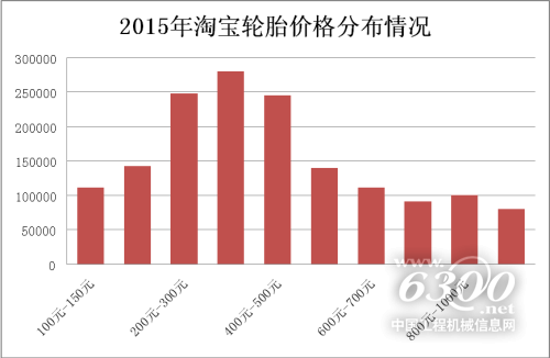 2015年,线上轮胎的销售价格基本维持不变,从150元到1500元不等,而200-500元的轮胎价格区间依旧最受消费者欢迎。本年度轮胎300-400元的成交量突破30000件大关。由此看出,平民化的价格仍然最受消费者的欢迎。