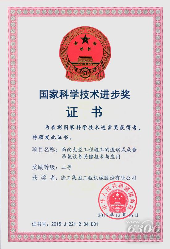12月16日,国务院颁发自然科学奖、国家技术发明奖、国家科学技术进步奖和国际科学技术合作奖。徐工集团“面向大型工程施工的流动式成套吊装设备关键技术与应用”项目获得2015年度国家科学技术进步二等奖,是工程机械行业年度唯一获奖项目。