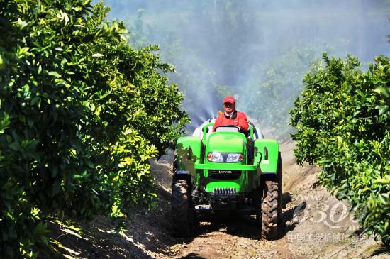 在土耳其安塔利亚省的一处果园里,十几台蓝色的雷沃拖拉机正在果园里进行喷药、除草等作业,成为当地果园作业的一道靓丽风景线。