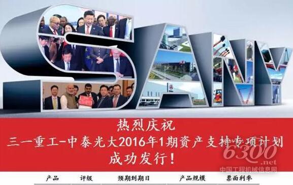 11月10日下午,三一重工发布公告,宣布“三一重工-中泰光大2016年1期应收账款资产支持专项计划”正式设立,总发售规模为131,500万元,这意味着工程机械行业首单上交所挂牌的资产支持证券成功发行。