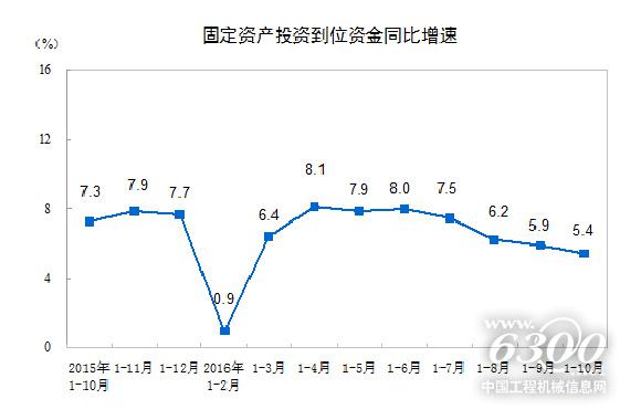 从到位资金情况看,固定资产投资到位资金496675亿元,同比增长5.4%,增速比1-9月份回落0.5个百分点。其中,国家预算资金增长16.1%,增速回落1.8个百分点;国内贷款增长7.9%,增速回落0.5个百分点;自筹资金下降0.3%,增速回落0.3个百分点;利用外资下降20.2%,降幅缩小0.8个百分点;其他资金增长32.5%,增速回落0.7个百分点。