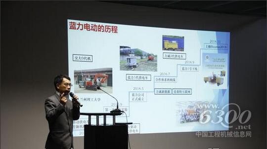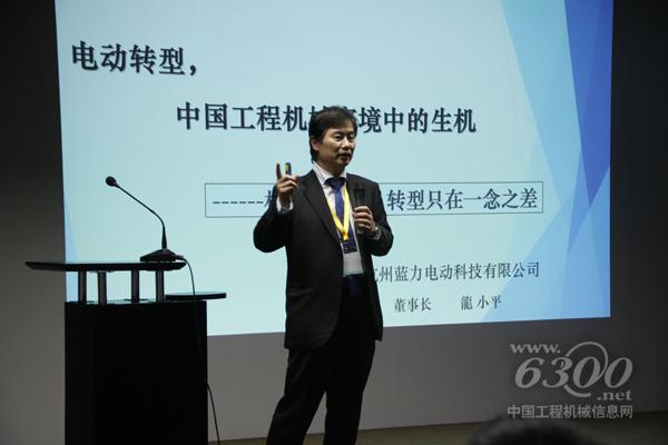 蓝力电动科技有限公司董事长龙小平讲解移动供电型电动挖掘机“机不动电动”的全新理念。