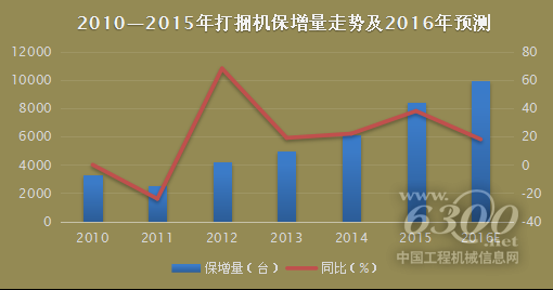 国内众多地区针对秸秆回收机械购买予以累加补贴的政策支持,并倡导多种项目立项快速形成群体化产业,加之用户对打捆机产品的刚性需求,市场调查显示,截至今年10月中旬,累计销售各种型号的打捆机9800余台,同比增幅18%左右。从近年市场走势分析,国内打捆机械在经历了2011年20%以上的同比下滑后,2012年实现68%的爆发式增长(这与当年玉米机械爆发增长同步),2013年~2015年进入同比增长20%左右的快速发展期,2016年市场需求持续稳步上行。