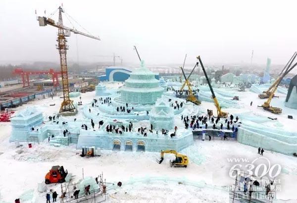 据现场施工方王经理介绍,今年共有70台起重机参与大世界冰雕施工,其中64台是徐工产品,这也已经成为大世界近20年的施工惯例。每年的采冰工作都是在11月底,12月初开始启动,因为这个时节,气温已经能够达到—20℃以下,冰质也已经符合要求,所有的冰都来自松花江。