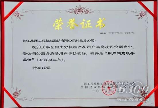 在全国土方机械产品用户满意度评价调查中,由于徐工铲运机械事业部生产的装载机产品质量用户满意度及售后服务用户满意度评价较高,被中国工程机械工业协会用户委员会授予“用户满意单位”及“全国用户满意产品”两个奖项,并颁发“用户满意产品”、“用户满意服务”荣誉证书。