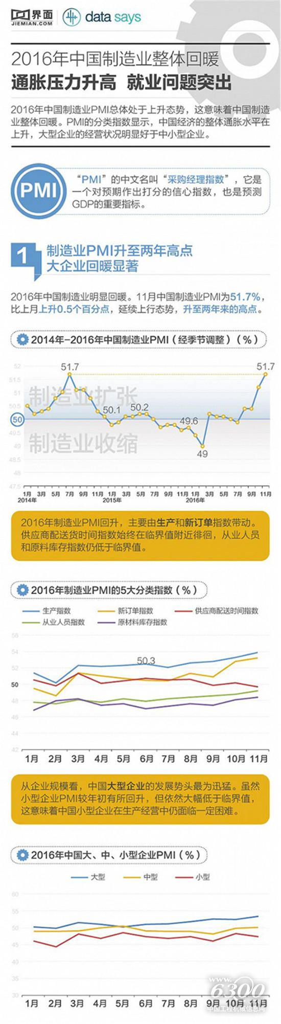2016年中国制造业PMI总体处于上升态势,这意味着中国制造业整体回暖。PMI的分类指数显示,中国经济的整体通胀水平在上升,大型企业的经营状况明显好于中小型企业。