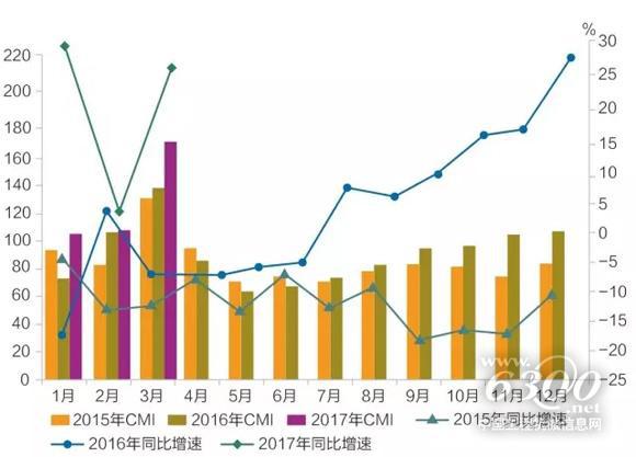 2017年3月份中国工程机械市场指数即CMI为171.23,同比增长25.66%,环比增加57.66%(依据CMI判断标准,170<CMI≤200,非常乐观,火爆发展)。