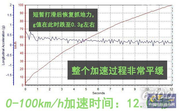 0-100km/h加速时间是汽车基本的技术数椐之一,用以反映车辆的加速性能。在本项测试中,我们操纵车辆从静止开始起步,随后全油门加速至100km/h,通过读取过程中的速度变化判定轮胎的情况。