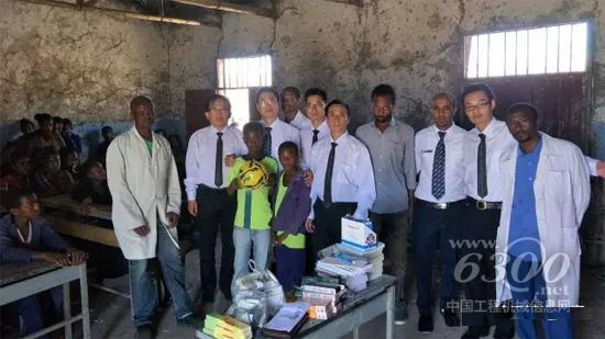 时间紧任务重,为了挤出时间去看孩子们,范云鹏5个人更加努力的工作,终于高质量高效率的完成工作任务。他们婉拒了埃方安排的游玩并表达了希望看望当地孩子们的意愿,埃方客户深受感动。一早,他们一行人员背着包裹,在代理商的陪同下,坐了两个小时的汽车,来到了最近的一所小学。说明来意后,校长激动的握着范云鹏的手,深切的表达着谢意。范云鹏向孩子们介绍了中国,介绍了徐工,把书本、笔等物品递到孩子们手中,鼓励他们好好学习,将来有机会可以来中国看看,可以加入徐工全球大家庭。看着孩子们渴望和喜悦的眼神,范云鹏等人被孩子们的淳朴和可爱感动了,他们纷纷拿出之前兑换的5000比尔币,约合3000元人民币送到了校长手中,用于改善孩子们的学习条件。