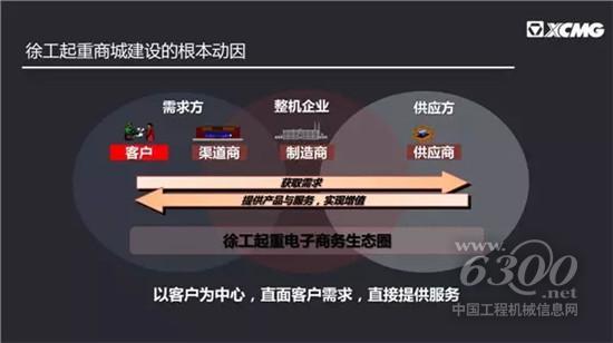 以客户为中心,以电子商务平台为沟通手段,将供应商、制造商、渠道商以及最终客户贯穿起来,电商平台与内部业务系统数据打通,构建一个统一、绿色、共享、数字化的电子商务生态圈,为客户、供应商以及渠道商直接提供优质的增值服务,为产品的定制化服务创造基础,成就徐工创新价值。