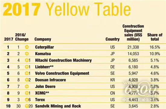 近日,世界领先的工程机械信息提供商——英国KHL集团主导发布的2017年全球工程机械制造商50强排行榜(Yellow Table 2017)出炉。卡特彼勒依然位居榜首,徐工集团、三一重工、中联重科等9家中国企业榜上有名,其中徐工集团(XCMG)排名第八,比上年晋升一位,成为榜单上唯一一家跻身前十强的中国企业。