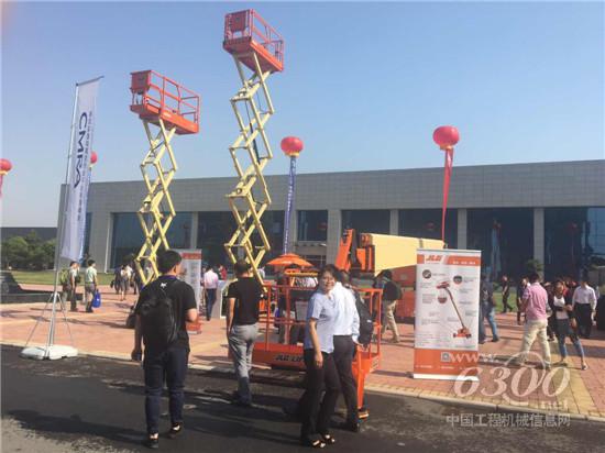 图为JLG在租赁峰会上展出电动剪式高空作业平台1932R和具有超强防护能力的1100系列直臂式高空作业平台