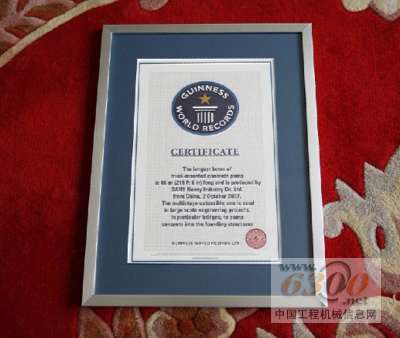 10月21日,三一重工收到了来自世界吉尼斯总部发来的证书,认定三一66米臂架泵车为目前世界上最长臂架泵车。