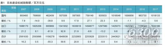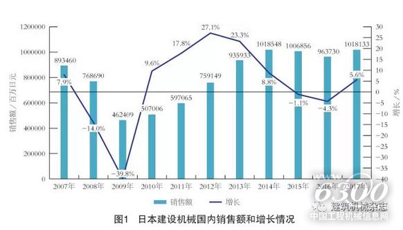 2007年和2008年,日本建设机械的销售额曾分别达到2.58万亿日元和2.59万亿日元,是近10年中最高的2年。但在世界金融危机和经济下滑的2009年锐减为1.16万亿日元,2010年后日本建设机械业状况有所回升,2011年起再度超过2万亿日元,2012年增长为2.25万亿日元。2013年日本建设机械销售额再度下降为2.23万亿日元,2014年又显著回升,年增长幅度超过9%,达到2.44万亿日元。2015年日本建设机械销售额合计为2.31万亿日元,比2014年减少5.3%,2016年为2.14万亿日元,比2015年减少7.4%。2015年和2016年日本建设机械销售额连续2年减少。