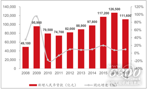 前三季度新增信贷总体平稳。工程机械单台设备价值量较大,支付方式主要包括全额付款、分期付款、银行按揭付款以及融资租赁付款。由于银行按揭、融资租赁为行业最主要的付款手段,行业景气度与社会信贷规模关联度相对紧密。2017 年前三季度,人民币累计新增贷款达到 11.16 万亿元,同比增长 9.84%,社会融资规模总体维持在平稳区间。