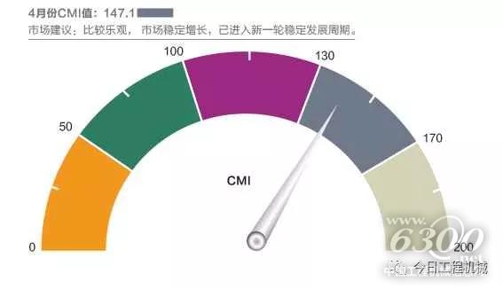 2018年4月份中国工程机械市场指数即CMI为147.1,同比降低6.67%,环比减小7.78%。依据CMI判断标准,130<CMI≤170比较乐观,市场稳定增长,显示工程机械行业已经进入新一轮的稳定发展周期。