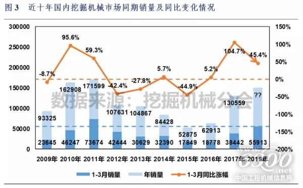 根据中国工程机械工业协会挖掘机械分会统计数据,2018年1-3月纳入分会统计的25家主机制造企业国内市场(统计范畴不含港澳台)共销售各类挖掘机械产品55913台,较去年同期上升45.4%,销售产品平均吨位16.0吨,较去年同期上升10.8%。其中2017年3月份销量36643台,同比上涨78.0%,销售产品平均吨位15.5吨,较去年同期上升5.4%。