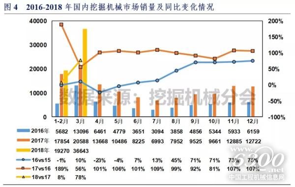 中国挖掘机械市场自2016年下半年进入高速增长通道,9月至12月连续四个月涨幅超过70%,2017年增长势头更加强劲,全年销量接近翻番增长。进入2018年以来,在高基数基础上,行业保持稳健增长态势。