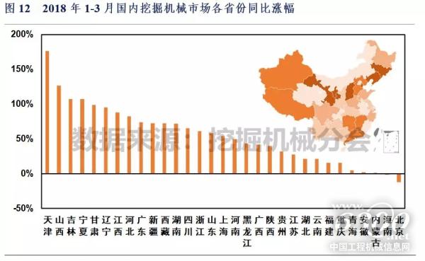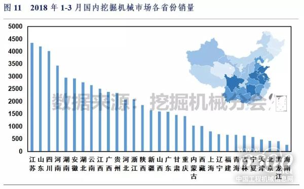 2018年1-3月华东、西南、华中、西北、华北、华南和东北地区挖掘机械销量分别17534、11445、9153、6206、5607、4238和1730台,同比涨幅分别38.4%、39.2%、45.1%、58.0%、59.7%、48.1%和83.7%。