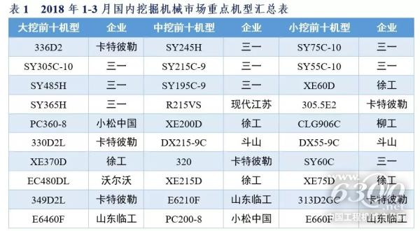 2018年1-3月,国内不同规格挖掘机械销量前十机型如下表所示。大挖市场主要被卡特彼勒、三一垄断,国内品牌在小挖市场的竞争力更强。