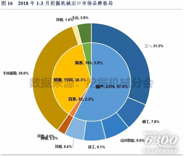 2018年1-3月国产、韩系、欧美和日系品牌销量分别为28625、7552、9296和10440台,市场占有率分别为51.2%、13.5%、16.6%和18.7%。三一、卡特彼勒和徐工占据国内市场前三位。
