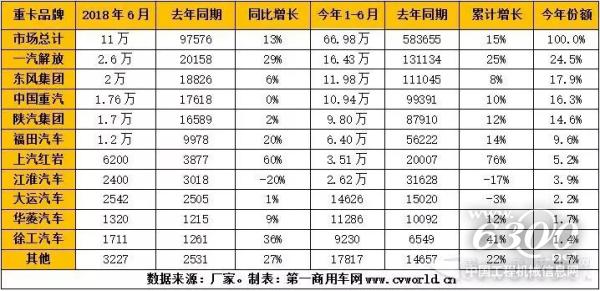 今年上半年,重卡市场累计销售66.98万辆,比去年同期的58.37万辆实现增长15%。