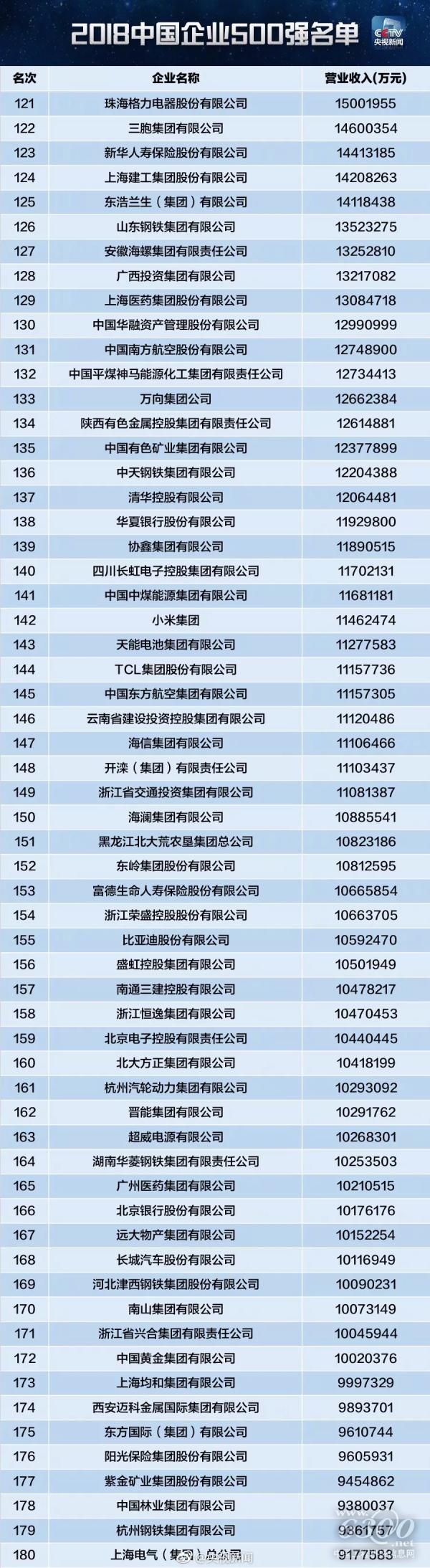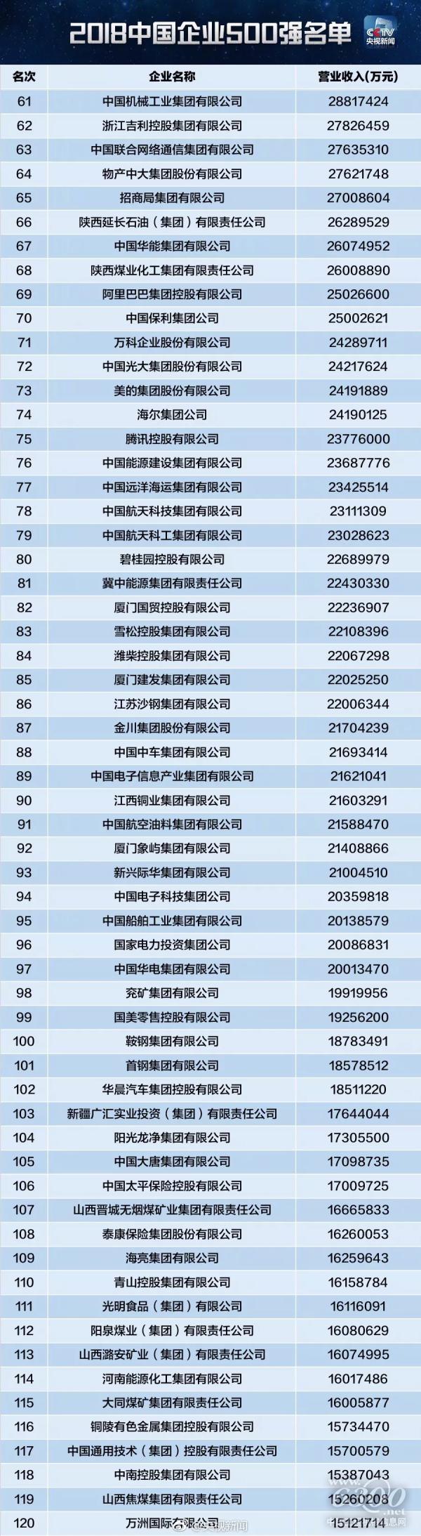 9月2日,中国企业联合会、中国企业家协会发布“2018中国企业500强”,国机重工母公司中国机械工业集团有限公司以2881.7亿元的营业收入位列第61位,较去年上升11位。