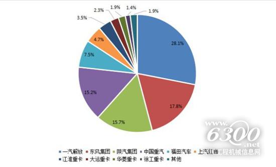 第四名中国重汽3月份销售重卡2万辆,一季度累计销售4.86万辆,市场份额为15.2%。福田汽车3月份销售重卡近1.3万辆,一季度累计销售2.41万辆,市场占有率为7.5%。