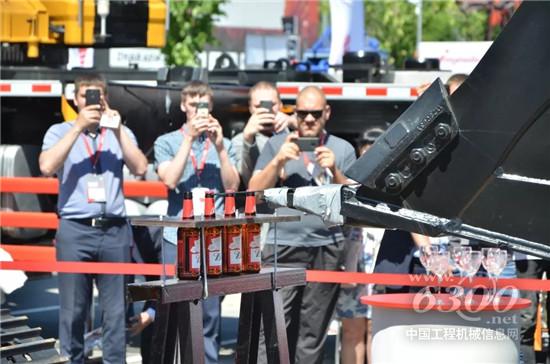 三一挖掘机在表演开啤酒瓶
