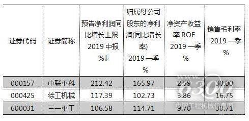 中联重科业绩弹性大。今年一季度三一重工、徐工机械与中联重科分别实现净利增长率为114.71%、102.735%与165.97%。从中报预告来看,中联重科预增上限为212%,远高于预增117%的徐工机械与预增106%的三一重工,由此来看,中联重科近来业绩弹性相对将更大。(见附表)