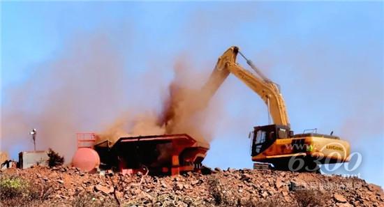 刚入锰矿基地,一大片褐红色的锰矿呈现在我们的眼前。工地安全检查程序严谨,我们在穿戴了劳保防护用品,进行了酒精测试后,开车到了柳工设备作业的现场。该客户于去年采购了包括柳工装载机、挖掘机、平地机和压路机在内的7台柳工设备,这些设备分别遍布于工地的4个开采施工区域。我们首先到达的是柳工970E挖掘机的工作现场,在那里,我们看到970E挖掘机庞大而矫健的身姿,正在忙碌地挖掘锰矿石,接着倒入筛分设备里进行筛分。一挖一倒,动作流畅连贯。