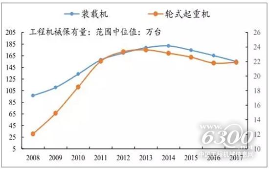 根据工程机械协会公布的工程机械保有量,截至2017年底,挖机和轮式起重机的保有量分别为155.7~168.6万台和21~22.8台,根据历年保有量范围的中位数,近年来挖机保有量保持缓慢增长,而起重机保有量甚至在2013年高点之后出现下滑。