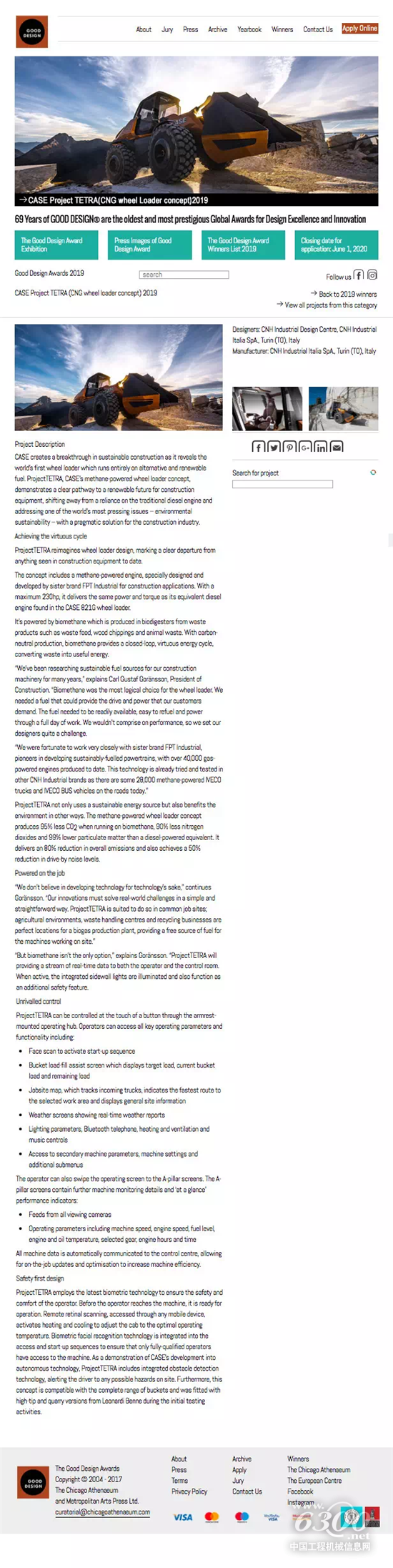 凯斯工程机械凭借 ProjectTETRA 荣获久负盛名的“优良设计奖”。ProjectTETRA 是一种甲烷动力概念轮式装载机,提供对可持续、互联、技术先进型未来施工的洞察。