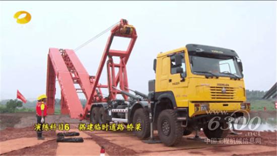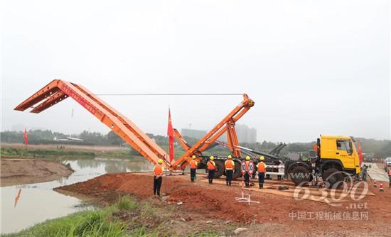 在“搭建临时道路、桥梁”演练科目中,模拟了雨情、水情快速发展导致长沙市望城某区域洪水冲毁了道路、桥梁,抢险救援物资无法运抵现场的紧迫场景。危难之时,中联重科重型工程机械应急救援队和驻湘武警某部交通第一支队紧急出动应急架桥车和铺路车进行抢险。演练中,中联重科应急架桥车停在损毁的桥梁边,指挥员、安全员、操作手,迅速到位。应急架桥车底盘稳健展平,操作机手手持遥控器,沉稳架设,短短14分钟,一座长25米、宽3.2米的临时桥梁就已搭建完毕,迅速恢复了通行。该临时桥梁可承载30吨,最大限度保障人员、设备、物资安全通过。