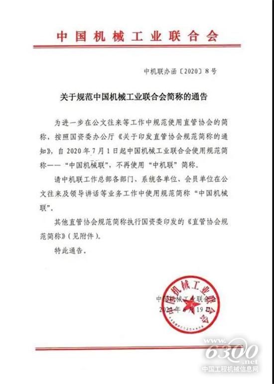 为进一步在公务往来等工作中规范使用直管协会的简称,按照国资委办公厅《关于印发直管协会规范简称的通知》,自2020年7月1日起中国机械工业联合会使用规范简称--“中国机械联”,不再使用“中机联”简称。