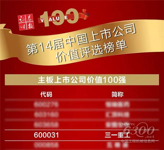 8月28日,由人民日报金融传媒集团指导、证券时报社主办的“第14届中国上市公司价值评选”榜单揭晓。三一重工(600031)高位入选“主板上市公司价值100强”,位列第四,同时斩获“主板上市公司十佳管理团队”。此外,三一重工(600031)董事会秘书肖友良先生入选“主板上市公司优秀董秘”。