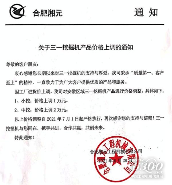6月28日,合肥湘元工程机械有限公司发布通知称,三一挖掘机自7月起涨价。