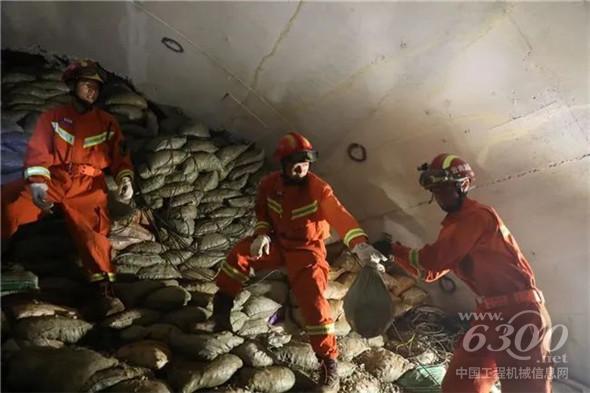 △救援人员正在搬运砂石袋对隧道顶部进行加固