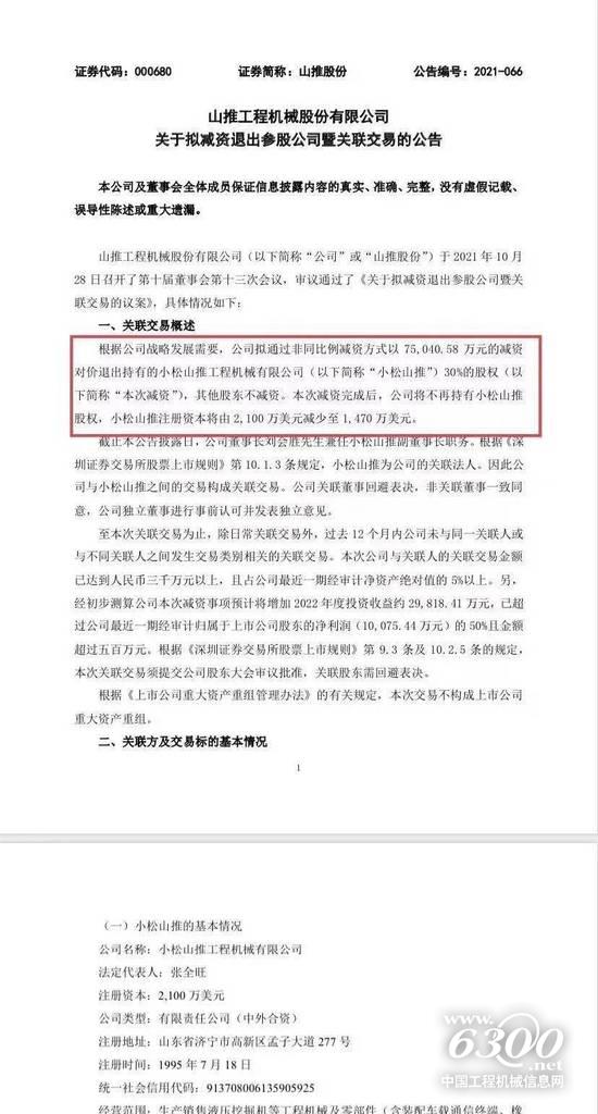 山推股份10月28日晚间公告称,根据公司战略发展需要,公司拟通过非同比例减资方式,以7.50亿元的减资对价,退出持有的小松山推工程机械有限公司30%的股权,其他股东不减资。本次减资完成后,公司将不再持有小松山推股权,小松山推注册资本将由2100万美元减少至1470万美元。