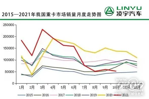 根据最新消息,今年10月份,我国重卡市场预计销售各类车型5.2万辆(开票数口径),环比下降12%,同比下滑61.5%,是今年以来月销量的第二低位;从历史的纵向对比来看,今年10月份的销量是最近六年来10月份销量的最低点。