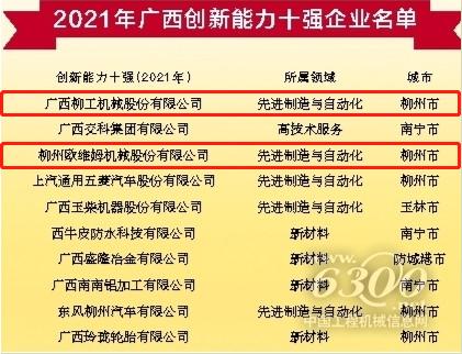 3. 柳工入选2021年广西高新技术企业百强、创新能力十强;
