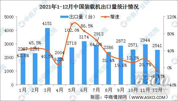 2021年1-12月,共销售各类装载机140509台,同比增长7.11%。其中:3吨及以上装载机销售128144台,同比增长4.21%。总销售量中国内市场销量106501台,同比下降0.07%;出口销量34008台,同比增长38.2%。